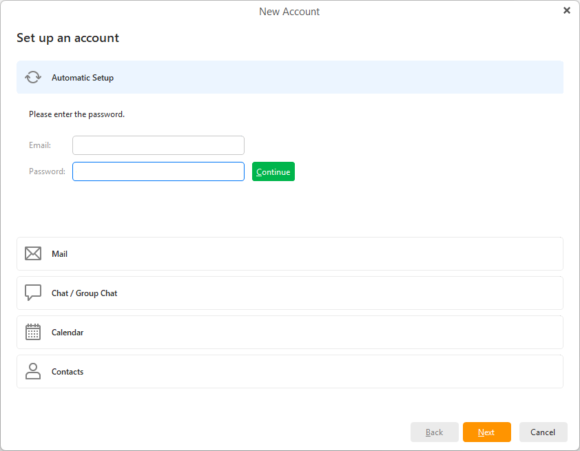 Cliquez sur "+ Ajouter un compte". L’assistant de configuration s’ouvrira. Saisissez votre adresse e-mail Variomedia et validez. Entrez ensuite votre mot de passe et cliquez sur Continuer.