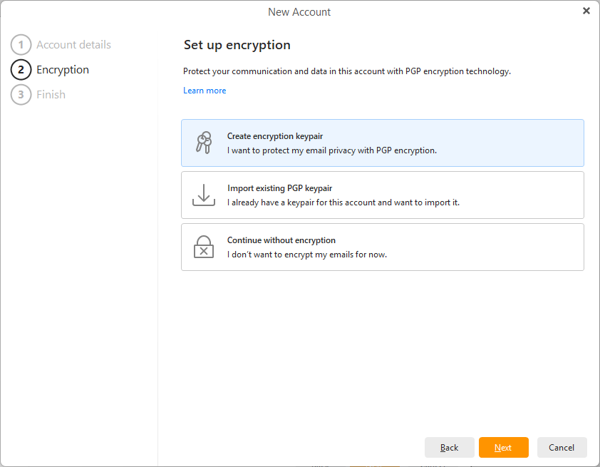 Configurez le chiffrement de vos messages ou passez cette étape. Pour en savoir plus sur PGP, cliquez ici.